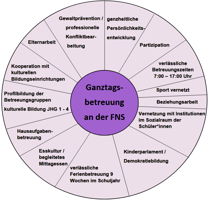 Das Profil des Ganztagsbetriebes orientiert sich am Schulprogramm unserer Schule, um eine verlässliche inhaltliche Verzahnung zwischen Schul- und Ganztagsbetieb zu gewährleisten und bietet somit einen haltenden Rahmen für alle Beteiligten. Um eine gute Kommunikation und Organisation in der Partnerschaft zu erreichen, hat der Ganztagsbetrieb einen Platz in der schulischen Steuergruppe und nimmt an Dienstversammlungen der Schule teil. Auf diesem Wege gelingt gemeinsame Schulentwicklung.